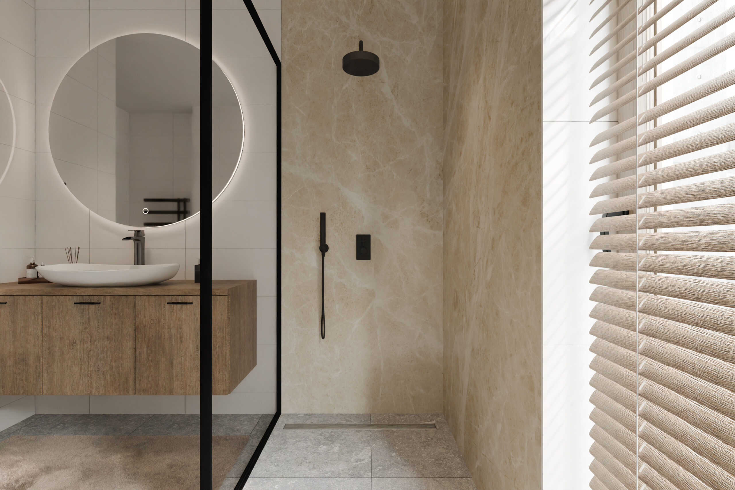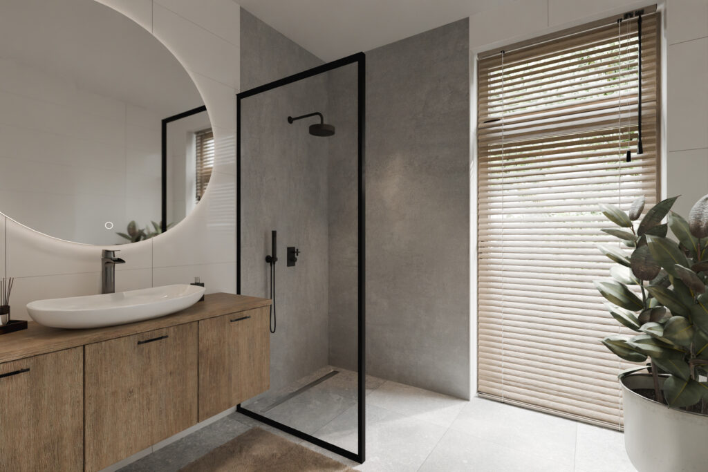 Diese Optik ist ideal, wenn du eine schlichte und industrielle Atmosphäre bevorzugst. Kombiniere Betonpaneele mit schwarzen Armaturen oder einer Glas-Duschkabine für ein trendiges Badezimmer, auf das du stolz sein kannst.