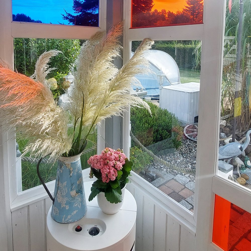 Setze die farbigen Kunststoffplatten in die vorbereiteten Rahmen ein. Diese passen perfekt und verleihen deinem Gartenhaus sofort eine ganz besondere Atmosphäre.