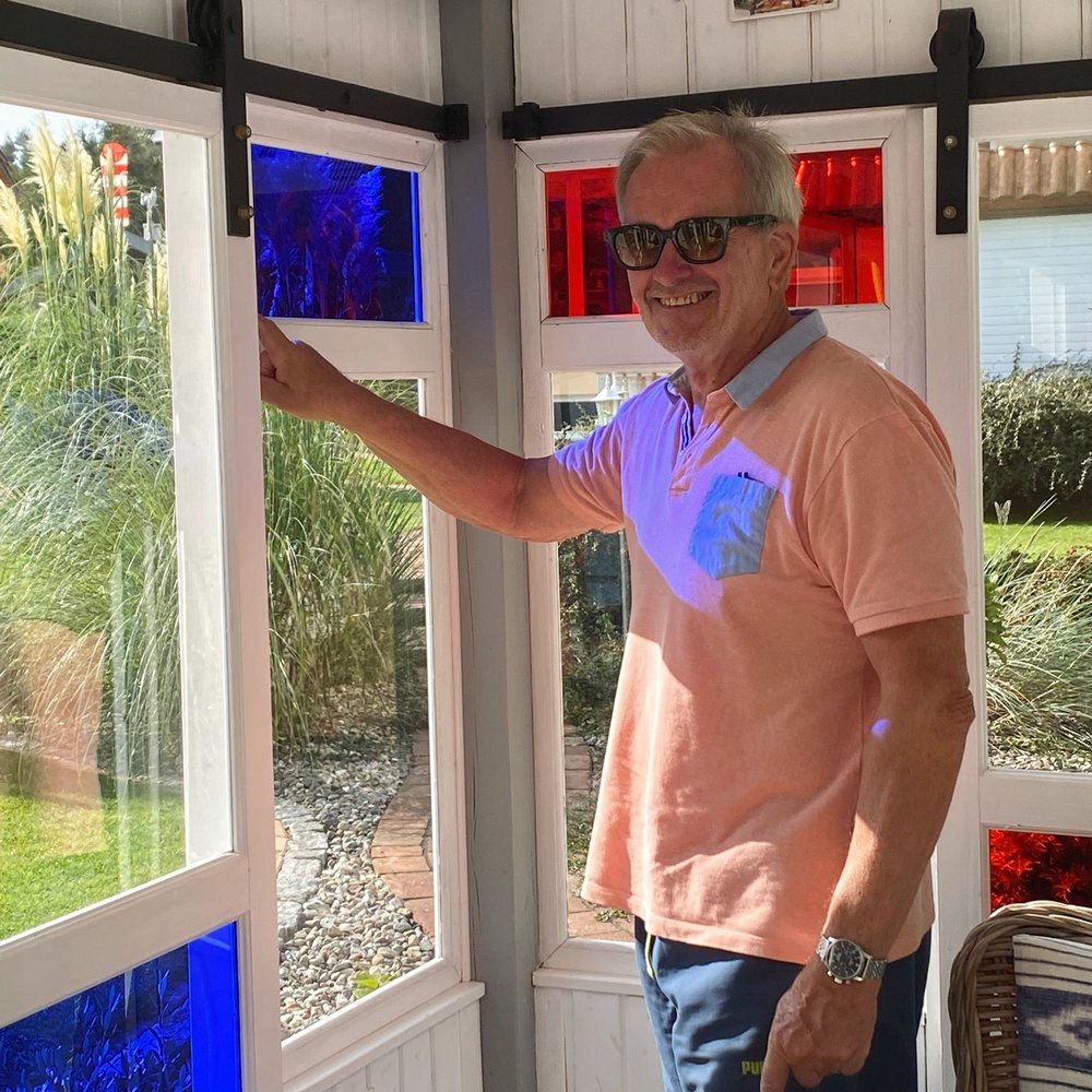 Um sein Gartenhaus farblich schön zu gestalten, experimentierte Reinhard zunächst mit buntem, herkömmlichem Glas. Dieses erwies sich jedoch als zu teuer. Danach griff er zu farbiger Folie, aber diese verblasste schon nach kurzer Zeit. Auf der Suche nach einer besseren Lösung stieß er auf Kunststoffplattenonline und fand dort farbige Kunststoffplatten in vier unterschiedlichen Farben, die perfekt in die Fenster- und Türrahmen seines Gartenhauses passten.