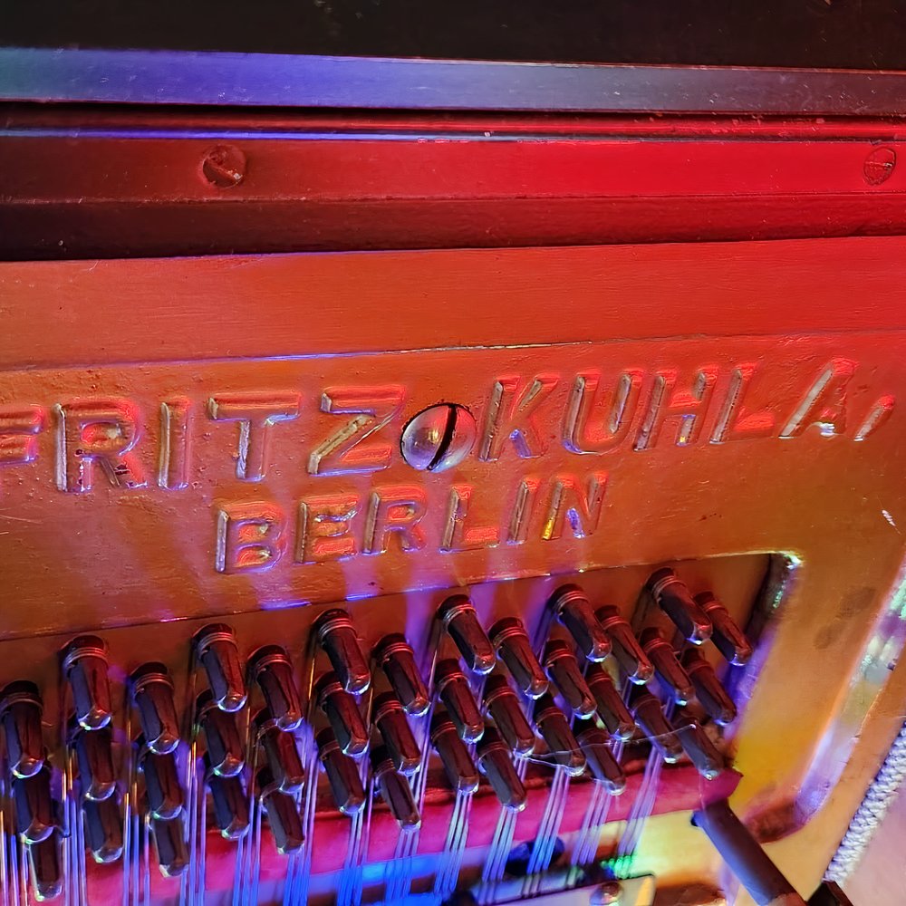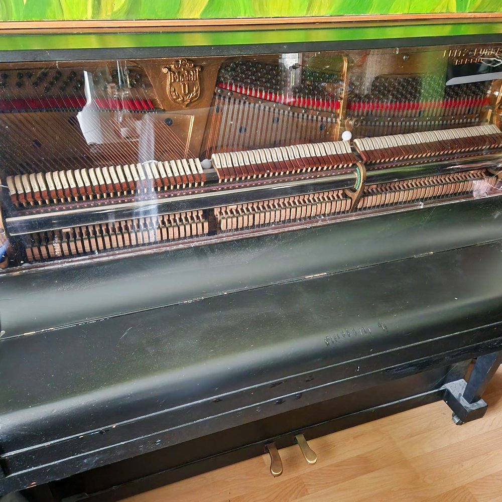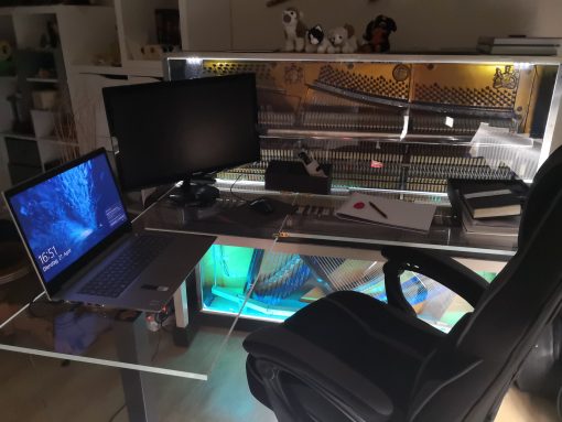 Carsten hat die Front seines geretteten Klaviers komplett durch eine spezielle Acrylplattentechnologie ersetzt. Die ursprüngliche Front war aus 2 Zentimeter dickem Sperrholz, schwarz lackiert. Er fertigte eine neue Front aus zwei Acrylplatten, die er mit Abstandshaltern miteinander verklebte: Die äußere Platte war grau getönt, die innere klar. Durch diese Konstruktion sieht man nun das Innere des Klaviers, was einen wunderschönen Effekt erzielt. Er möchte noch dezente LED-Beleuchtung hinzufügen, damit das Keyboard gut bespielbar bleibt.